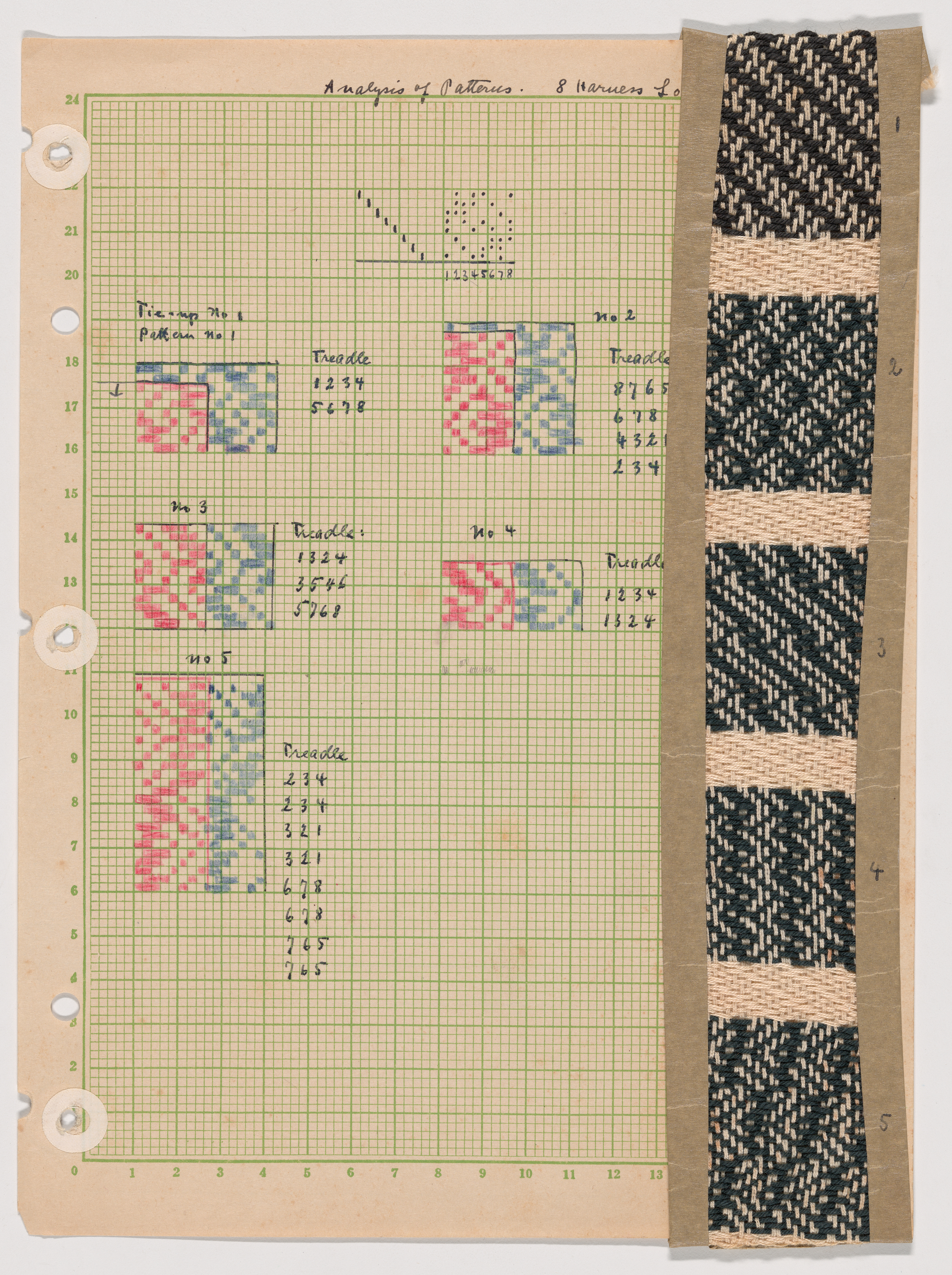 Grid diagram of 8 Harness weaving pattern with sample, 1945–58